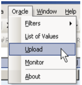 - Click on the “Oracle” menu in the Excel Menu toolbar at the top of the page. Click on “Upload” from the drop down menu.