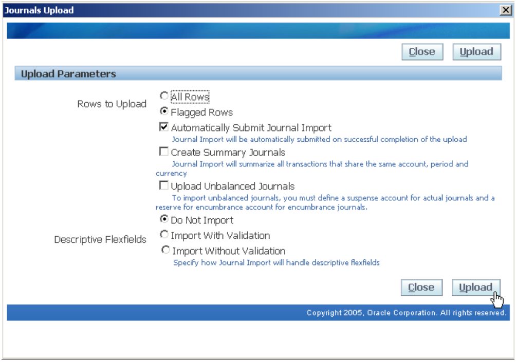 - A “Journals Upload” window opens showing the following parameters, which automatically default to the correct settings: