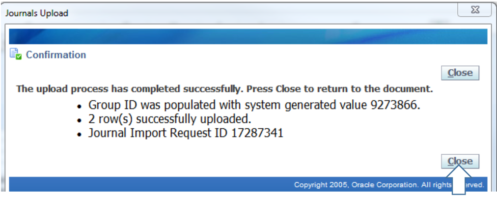 - Once the upload process completes successfully the “Journals Upload” window will display a message listing out how many rows were successfully uploaded and provide a Journal Import Request ID number. The Journal Import process will start automatically and can be monitored using this request id number.