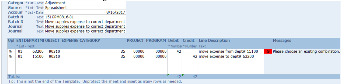 This section is filled in by the Journal Wizard after an upload attempt has been made. If an account combination is invalid or the journal entry is out of balance a sad face and an error message will display. If the upload process was successful, a happy face will display next to each account combination.