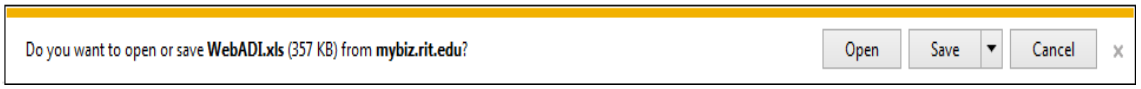 - Select “Open” when prompted to either open or save “WebADI.xls”