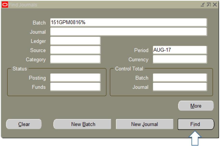 - Your entry will appear in the “Enter Journals” window. Note your batch name will include the Upload ID# for that batch. You will need to use the “%” wildcard every time you upload an entry in ADI. You will not need to memorize the upload ID #