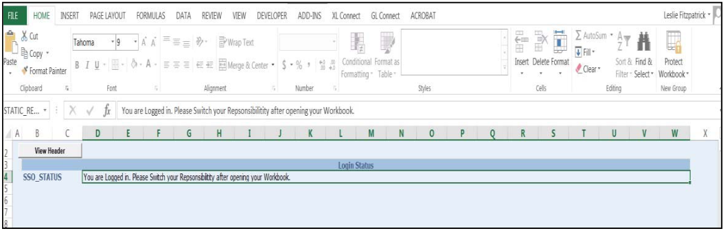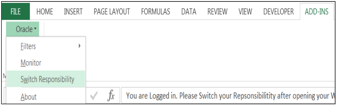 - Select a responsibility by clicking on the “ADD-INS” tab and selecting “Switch Responsibility” from the Oracle drop down list.