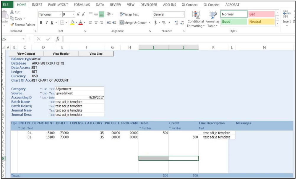 - A blank Journal Entry template has been downloaded into Excel. Enter journal information in the white cells. Detailed descriptions of field content requirements are provided at end of this document. After data is entered, see instructions on uploading the entry to Oracle. All the tools and functions that are available in Excel can be used to enter data into the template. Reviewing the template from upper left to bottom right.