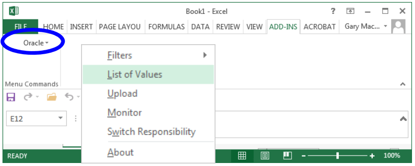 - In addition to double clicking on the cell for List of Values, click in the desired cell, then click “ADD-INS” on tool bar -> “Oracle” menu on left side in the Add-In toolbar. Select “List of Values” from the drop down menu.