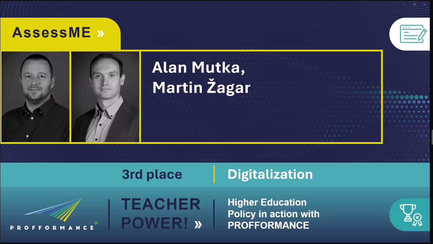 The PROFFORMANCE International Higher Education Teacher Award is organized by the prominent PROFFORMANCE+ consortium, a collaborative initiative involving several European ministries, including the Croatian Ministry of Science, Education and Youth. This partnership underscores the project's commitment to advancing the quality and competitiveness of higher education across Europe, celebrating excellence and innovation in higher education across Europe. For AssessMe to be recognized among the best, it highlights the exceptional quality and forward-thinking approach of our faculty. This achievement is even more significant considering it was selected from a competitive pool of 286 submitted projects from institutions across Europe.