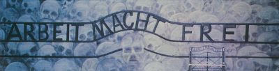 The perversion of language appeared vividly at Auschwitz where the entranceway was marked by a tall gate labeled “Arbeit Macht Frei” (“Work Makes Free”). In his work by that name, Bloch superimposes the gateway over a space filled with skulls and death masks. The pathetic irony is made clear by the death masks: only through death was there freedom, for the people were murdered by overwork. The tones are a pale, whitish-blue, cold and deathly in their hues. In the lower portion of the painting is a second gateway-only this one has been barricaded with a red and white barrier so that no one can ever enter. It is Bloch’s way of saying “never again.”
