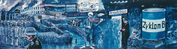 Several of the works superimpose a very large foreground figure or image against a detailed backdrop with a great deal of activity. One example is Reception Deception (essentially a detail of the painting of the same name), which has a skeletonlike figure with black sockets for eyes in a camp uniform (no. 1938) playing the violin on a platform. Behind him is a reception scene with the boxcars being unloaded, dead bodies piled up, and the remainder of the people herded into long lines forming the shape of a swastika. In the background, boxcars are lined up at least three tracks deep, as if to infinity.