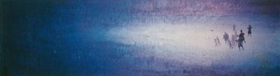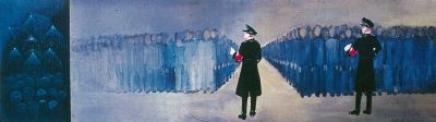 Reception Deception is a chilling work-brittle and crisp in its shades of blue against the stark whiteness of the snow-and haunting in its meaning. Three emotionless skeletal figures are playing music to accompany the newly arrived transportees being led to their deaths. The death march, with musical accompaniment, comes across as a Danse Macabre, only here the scene is played for real as the skeletons (probably human, but more dead than alive) play for the newly arrived (and soonto-be-dead) masses. As the lines move slowly, they form the shape of a huge swastika. A few faces, blue with cold and suffering, look up at the musicians in puzzlement, at a world gone mad. The landscape is stark, bare, and flat, except for some camp barracks and the now-empty boxcars off to the side.