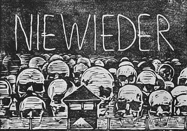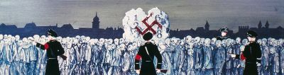 Dachau is where David Bloch was held captive until he was miraculously freed. As viewers we witness a roll call with the inmates’ backs to us. Bloch constructs the work so that we become part of the group; we look where they look, seeing the same endless line of victims and the black-uniformed oppressors. To erase any doubt about what this scene is, the word DACHAU, in German Gothic printing, blares out at us with the immediacy of a newspaper headline. Five folded uniforms lie on the ground; even the dead had to be accounted for and recorded.