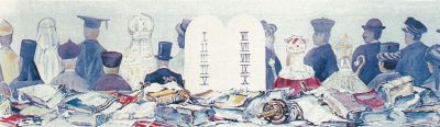Bloch uses the image of the Ten Commandments frequently in his works as an indictment of those who ignored the laws of God. In The Powers That Be a large tablet of the Ten Commandments faces us. Men with different kinds of headdresses representing the academic world (mortarboard), religious powers (miter), and political and economic powers (crown and top hat) have their backs to us, to the Ten Commandments, and to the fragments of Jewish civilization scattered in the foreground. Books are shown in disarray; not only has man turned his back on the laws that can help us to live decently, but also on the great literature of the world-literature that for centuries has sought answers for the great problems of life.