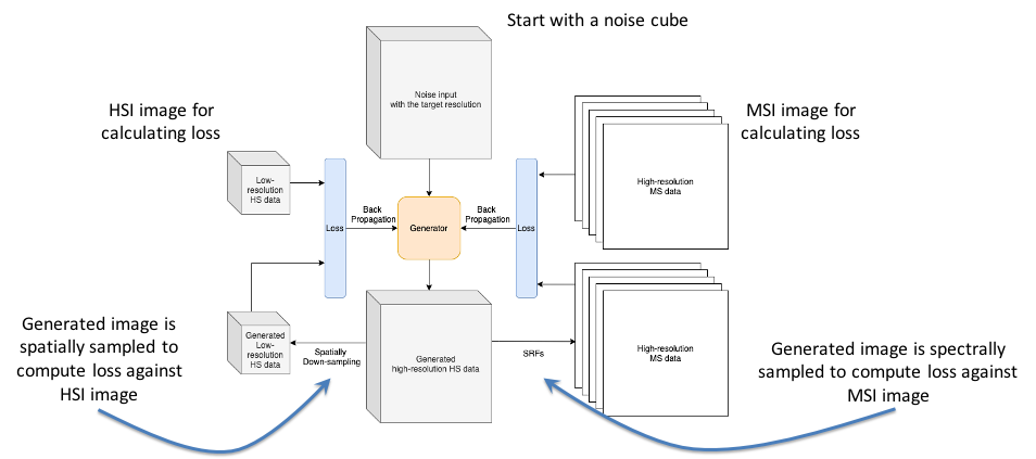 Learning framework developed for fusion of high spatial resolution MSI with low spatial resolution HSI. Note how two loss functions are used to ensure both spatial and spectral accuracy.