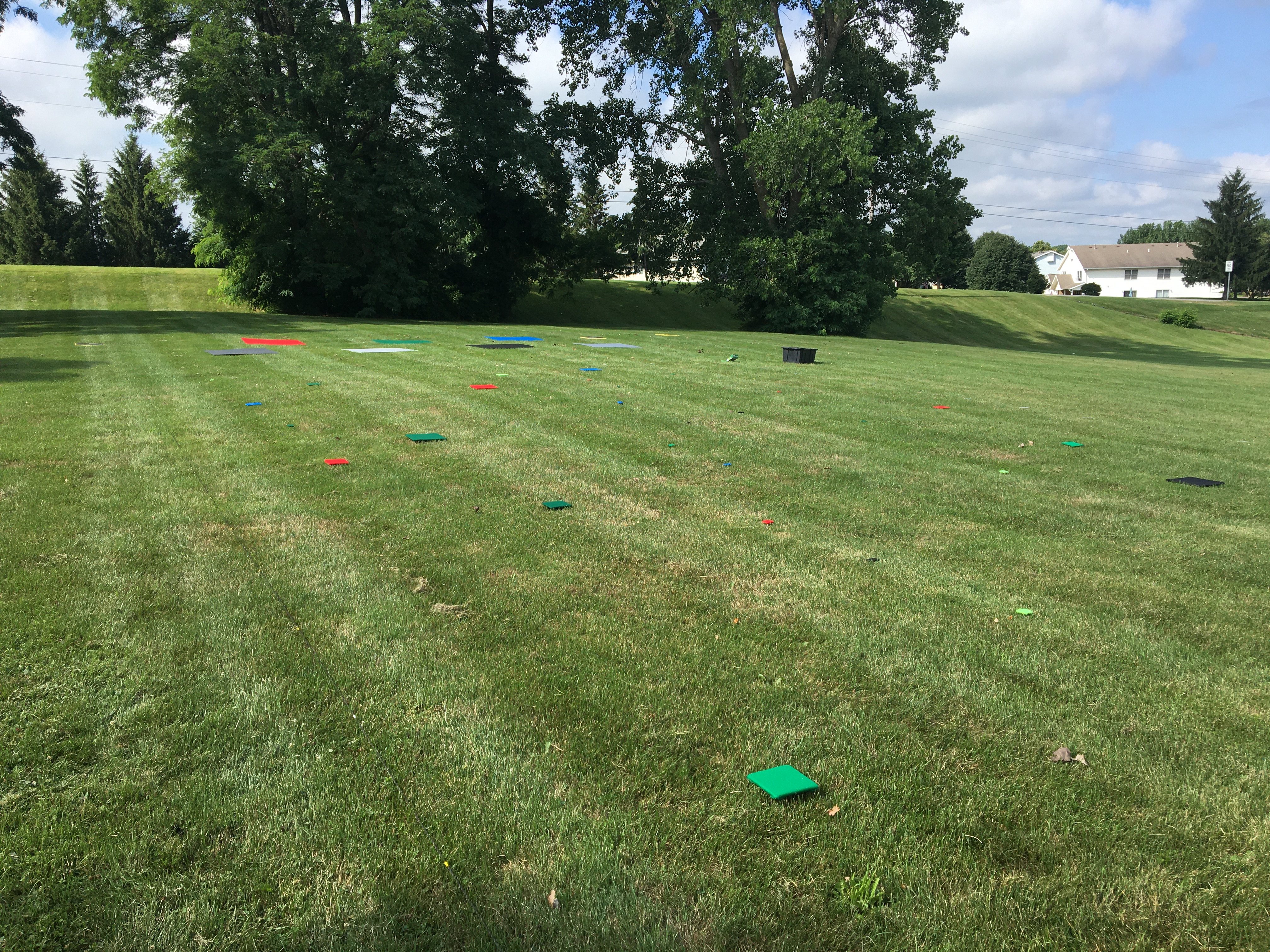 Finally, a third task planned and executed an experiment campaign using the RIT UAV hyperspectral imaging system to collected data at multiple altitudes. This alleviates the need to simulate data and will provide the opportunity for quantitative assessments of novel algorithms developed under this program. A ground photo of the target layout is shown in Figure {Messinger-NURI-figure3.jpg}. These images will be used in future years of this project.