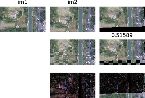 Example comparison image set to show that HNET performance is good on unseen and unrelated data. Img1 is the reference image while img2 is the warped image. The weighted average loss metric is shown below the result (upper left). Values between 0.5 and 0.59 are good while values below 0.49 are very good. We also visualize the alignment by taking the reference and warped images and overlaying them in a grid / checkerboard pattern so that alignment of features can be easily evaluated (second row). The absolute difference is shown (bottom row).