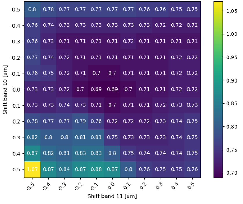 The root-mean squared error (RMSE) in the retrieved temperature from the split window algorithm by shifting of the nominal Landsat TIRS bands.