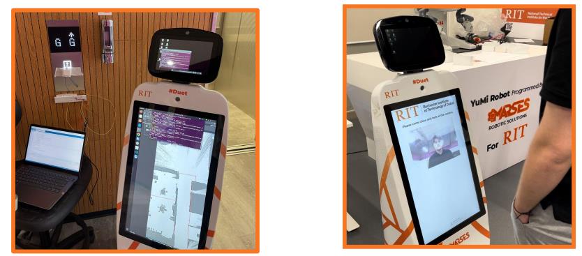 The Automated Duet Receptionist Robot at the Rochester Institute of Technology (RIT) represents a leap forward in robotics technology, designed to traverse the floors of Building D. This advanced robot is equipped with lidar, cameras, infrared sensors, and actuators, enabling it to expertly navigate complex environments. It can smoothly interact with elevators and avoid obstacles, as well as recognize current students and display their information ensuring seamless movement and help throughout the building. The Duet's capabilities extend to accurate floor mapping, elevator operation, and engaging interactions with visitors, enhancing both functionality and visitor experience at RIT.