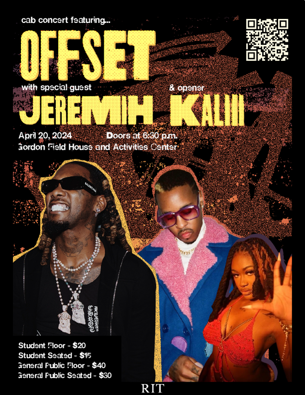 For the first time in four years, the College Activities Board Concert ft. Offset, Jeremih, and Kaliii on Saturday, April 20, 2024, at 8 p.m. in the Gordon Field House and Activities Center as part of RIT’s SpringFest. Tickets are available online at rittickets.com and the RIT Box Offices. We are excited that Concerts Are Back!