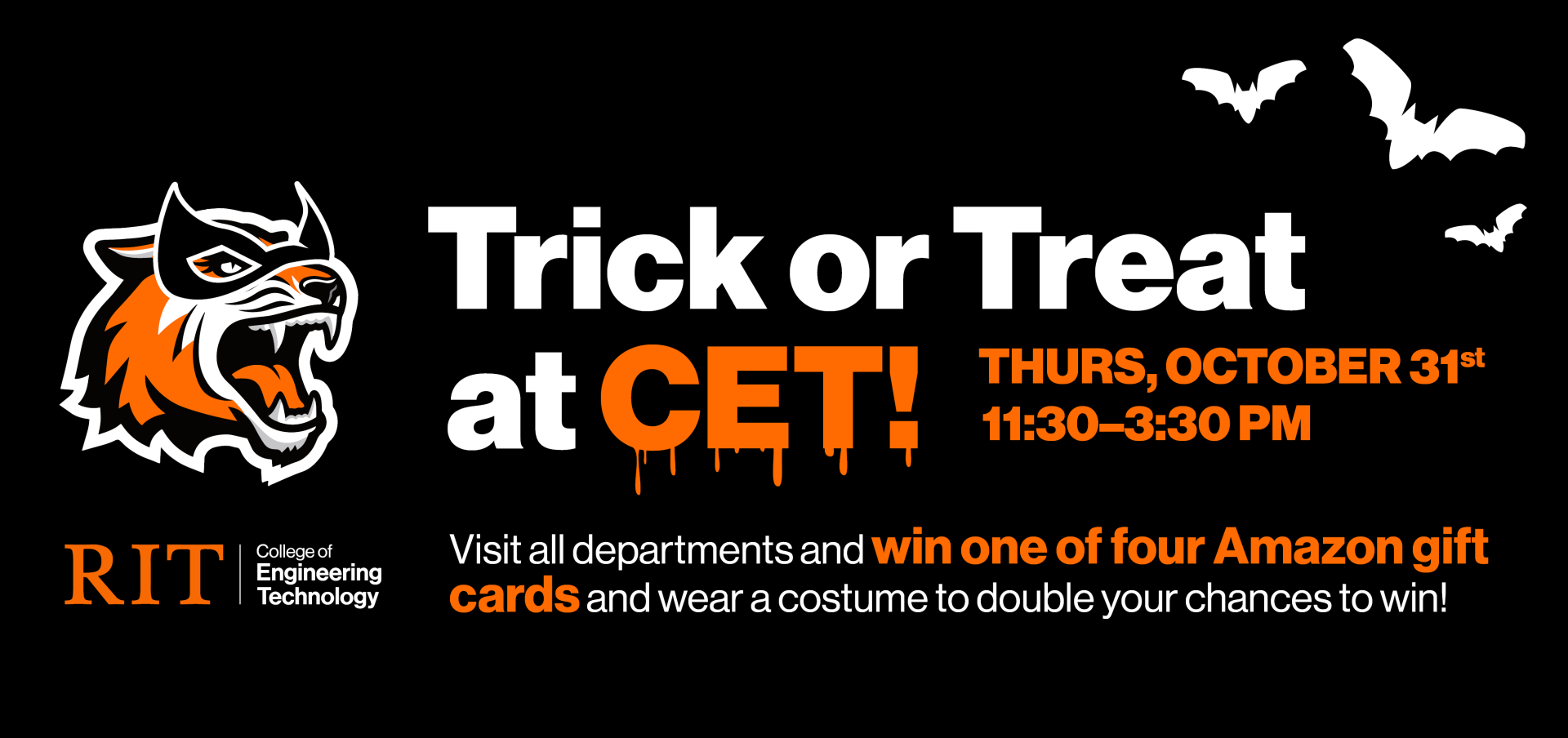 Start at the new Advising Suite in Golisano 1105 (hallway past Ctrl Alt DELi) and grab your punch card. Visit all the departments to get treats and your card punched. Finally, head to ENT McGowan Commons for the Dean’s Office and WIT. Turn in your completed card to the Dean’s Office table in McGowan to be entered in the raffle for a chance to win one of four Amazon gift cards! Wear a costume to double your chances to win by entering the raffle twice!