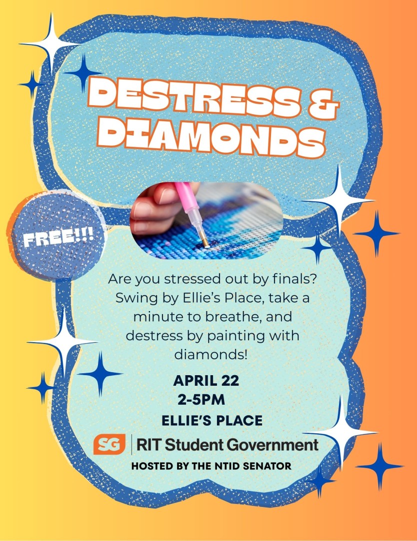 Are you stressed out by finals? Swing by Ellie's Place, take a minute to breathe and distress by painting with diamonds! Free paint by diamond supplies will be provided as well as templates to create diamond animals, insects, flowers, and plants.