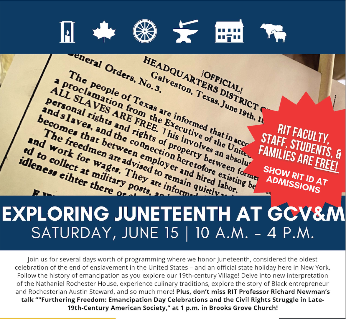 Join our university-museum partner, Genesee Country Village & Museum to honor Juneteenth, considered the oldest celebration of the end of enslavement in the United States – and an official state holiday here in New York. Follow the history of emancipation as you explore our 19th-century Village! Delve into new interpretation of the Nathaniel Rochester House, experience culinary traditions, explore the story of Black entrepreneur and Rochesterian Austin Steward, and so much more! Plus, don’t miss RIT Professor Richard Newman’s talk “"Furthering Freedom: Emancipation Day Celebrations and the Civil Rights Struggle in Late-19th-Century American Society,” at 1 p.m. in Brooks Grove Church!