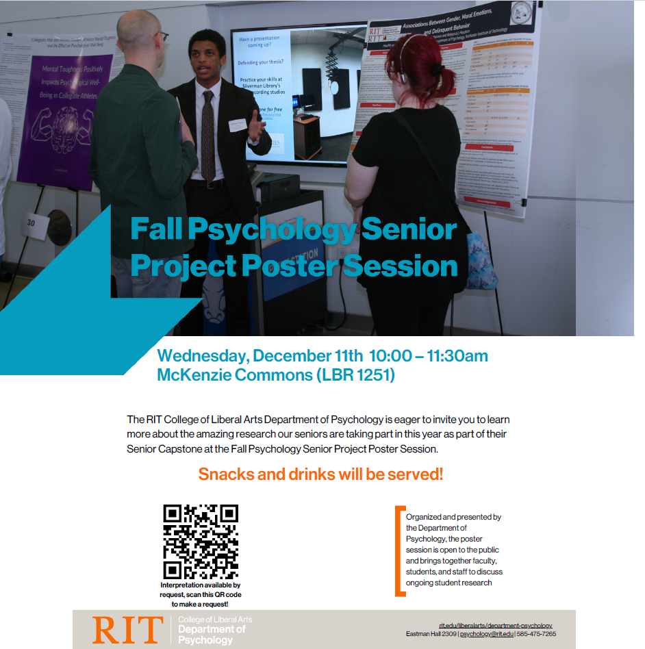 The RIT College of Liberal Arts Department of Psychology is eager to invite you to learn more about the amazing research our seniors are taking part in this year as part of their Senior Capstone at the Fall Psychology Senior Project Poster Session