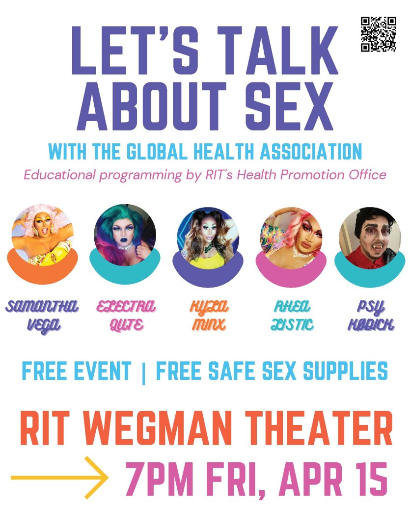 Please join members of the Global Health Association @ RIT for this educational program about sexual health coupled with a professional drag show. Members of RIT's Health Promotion Office will provide important information to the attendees while professional drag queens from the Western and Central NY area provide the entertainment for the evening.