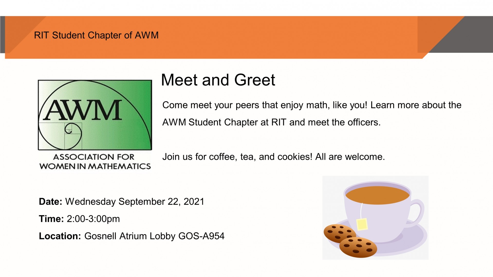 Learn more about the Association for Women in Mathematics (AWM) Student Chapter at RIT and meet the officers. Join us for coffee, tea, and cookies!