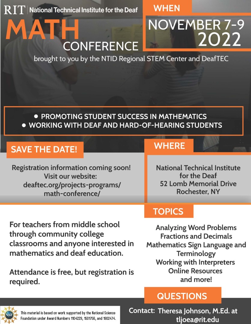 This year’s conference, sponsored by NTID’s Regional STEM Center and DeafTEC, will be held at the National Technical Institute for the Deaf (NTID) November 7-9, 2022. As planning continues, more information will be provided. Sign language interpreters and CART will be provided for all workshop sessions. Please make note of any other accommodations needed when registering.