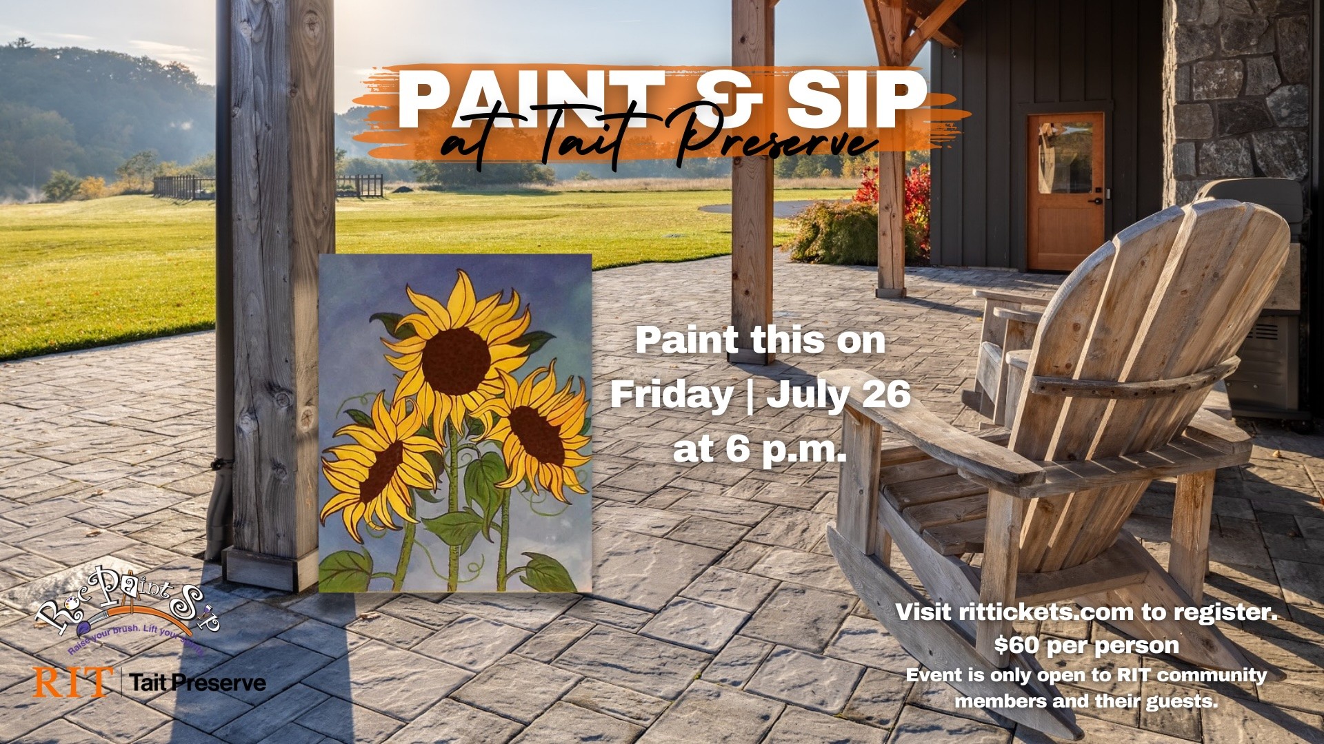 Join us for Paint & Sip hosted by Tait Preserve on July 26th at 6 p.m. Enjoy a relaxing night of painting "A Sunflower Trio" by Bobby Padilla from Roc Paint & Sip. Bobby will lead the instruction from start to finish. A 16x20 canvas and supplies will also be included at the event. Guests can also enjoy Buffalo Chicken and BBQ Pork Sliders Station.