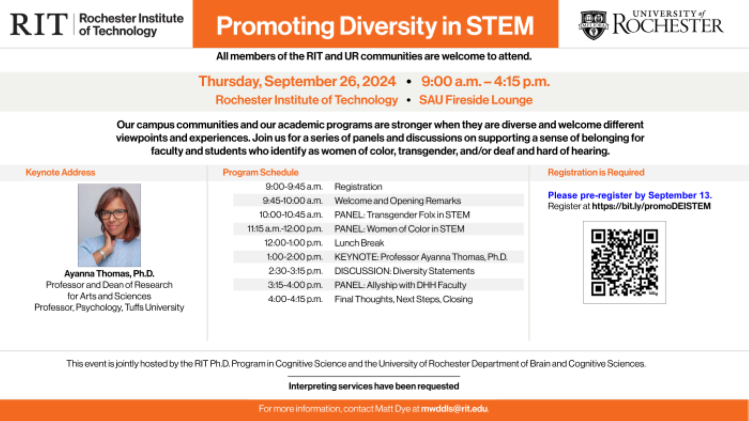 Image description: Flyer with program title in white text on a black background. Event time/location in orange inside orange brackets. Description and program schedule follow in black text. Picture of keynote presenter above program schedule. Headings for keynote address, program schedule, and registration in orange text on grey background. QR code for registration. Logos for RIT and U or R in black on footer.