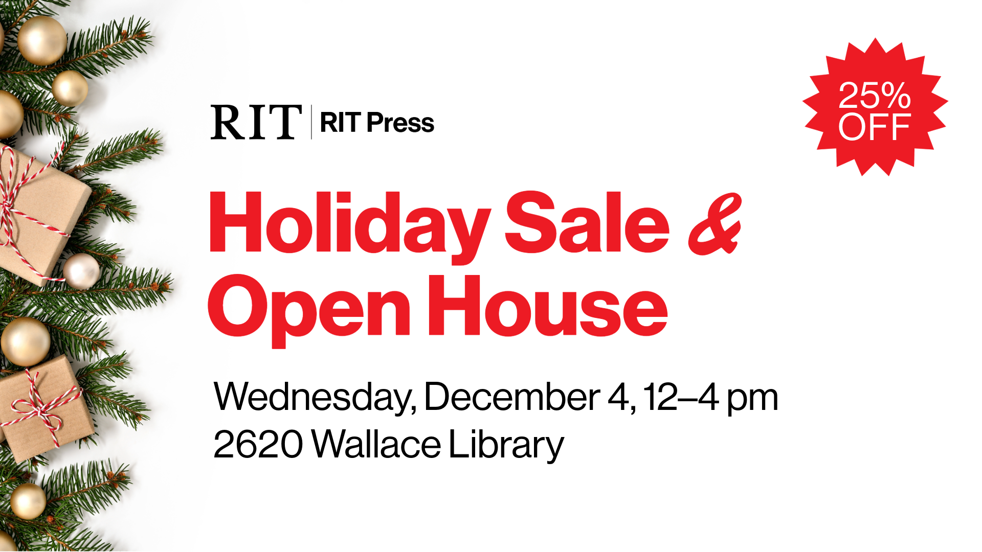 Join RIT Press for a holiday sale and open house! Enjoy 25% off all books and greeting cards. Find a unique gift for someone special! Click here to browse the latest publications from RIT Press.