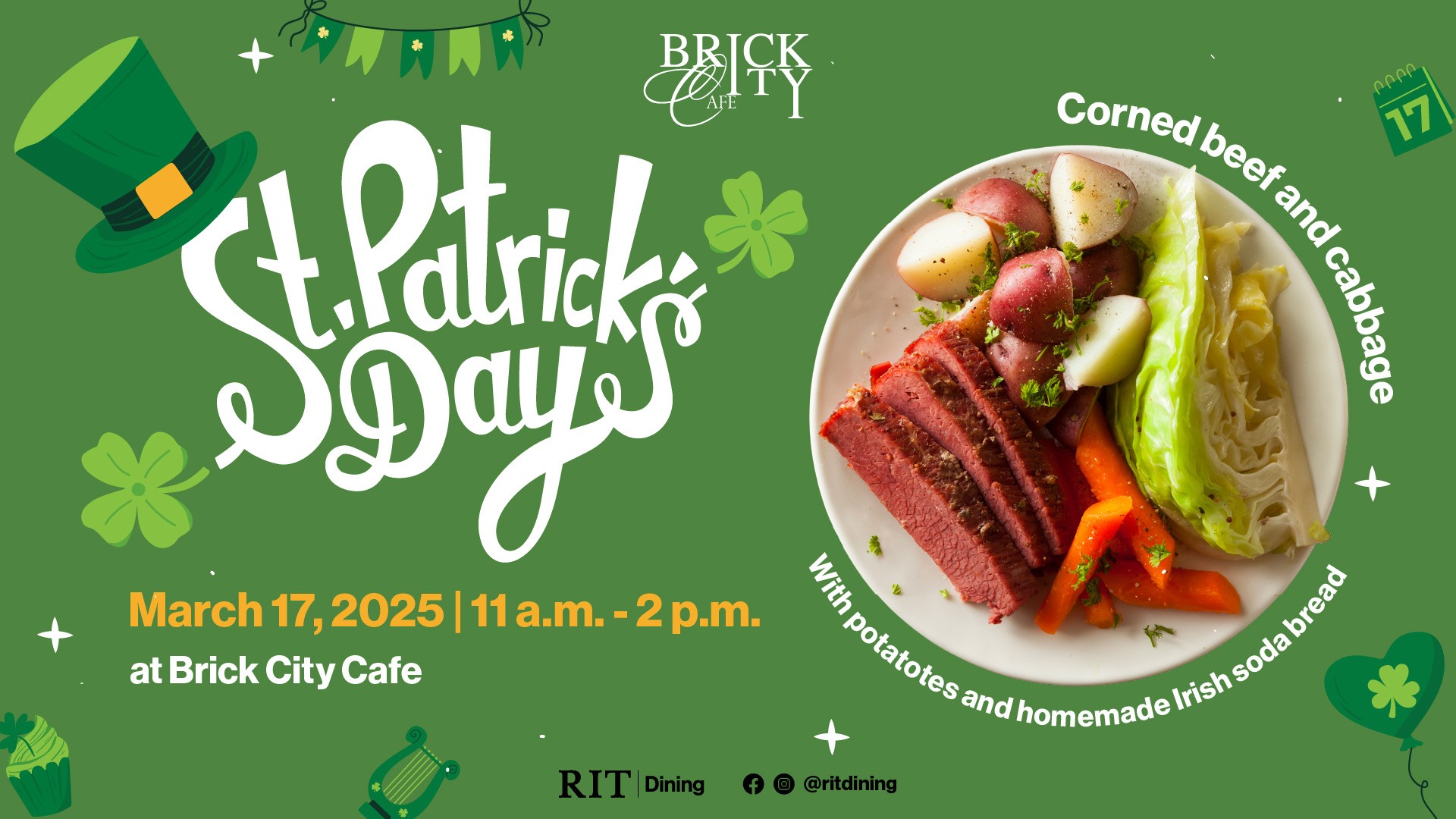 We're feeling lucky we get to celebrate St. Patrick's Day at Brick City Cafe! Join us on Mon., March 17, from 11 a.m.- 2 p.m. The menu includes: