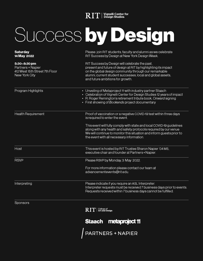 Please join RIT students, faculty and alumni as the Vignelli Center for Design Studies celebrates RIT Success by Design at New York Design Week.