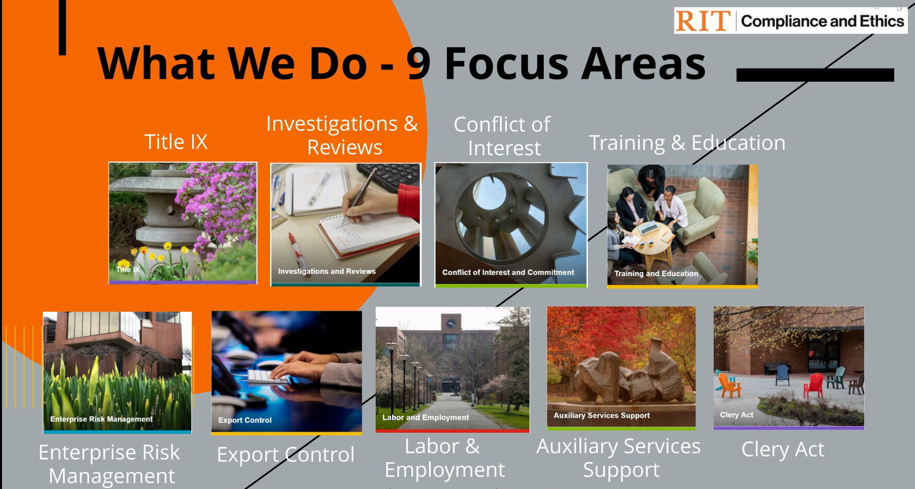 A brief overview of the services and focus areas that are provided by the Office of Ethics and Compliance here at RIT.