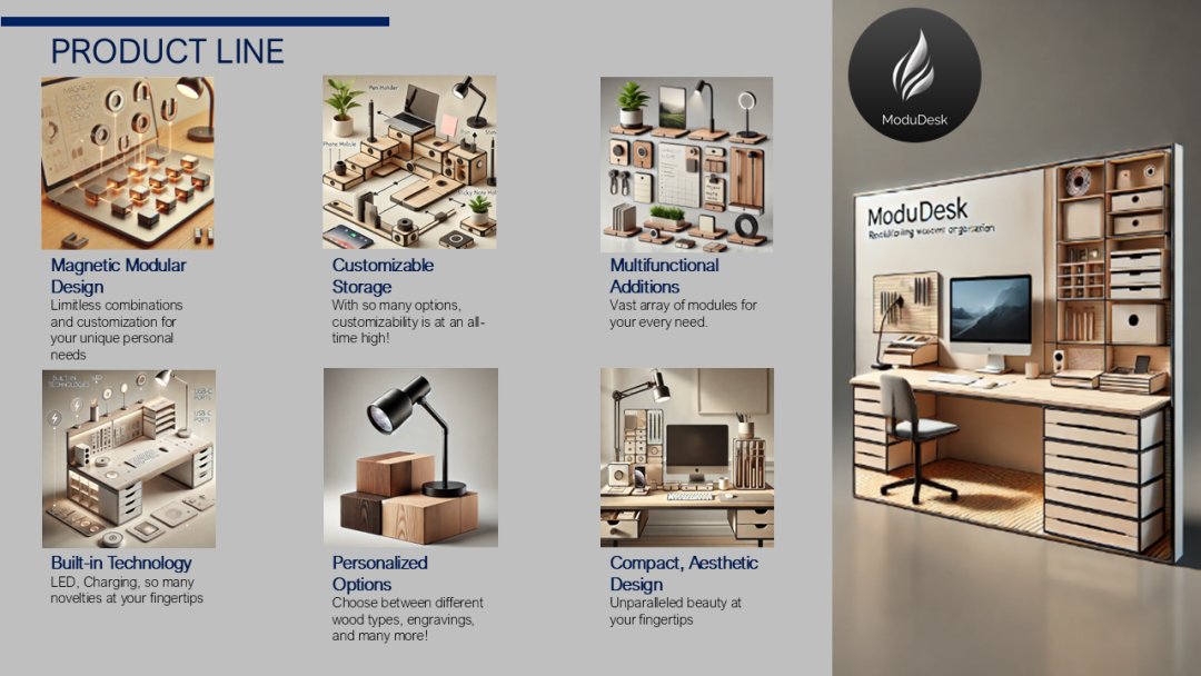 Hello, we are ModuDesk. A proof of concept idea to create a desktop organizer that adapts to your needs. We have all been there haven't we. Tangled wires, that one pen rolling away all the time, can't find that one thing you swore you placed there 3 seconds ago. We aim to target this problem, and provide you an effective, but also aesthetic solution. ModuDesk utilizes magnetic modular blocks, which can snap together and there are a variety of different options to choose from. Depending on your needs, you can select which modules you would like! All modules fit together seamlessly and effortlessly. All of the products on the market currently aren't scalable, and they tell you which things fit where. ModuDesk is different. We want to evolve with you. As your needs change throughout your years, we will always be there, evolving with you. As long as you need a desk, you have ModuDesk. We strive to fulfill the mantra, Your Desk, Your Way. Your desk should adapt to your unique personality and how you feel most productive. Fully utilize how to make your desk your very own, not only to boost your productivity, but also just a nice desk to look at and see how far you've come.