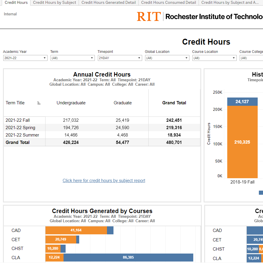 Detailed credit hour reports showing both generated and consumed hours across the University and at each college.