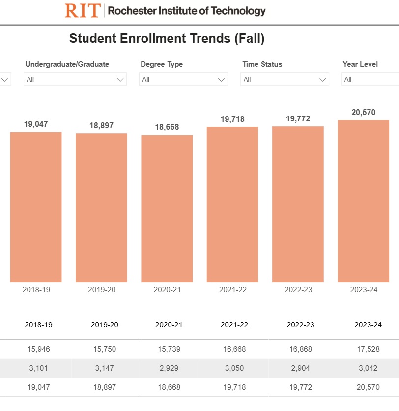 Interactive dashboards of student enrollment data. Includes enrollment counts by program, gender, and race/ethnicity.