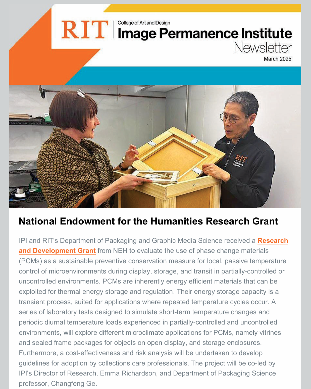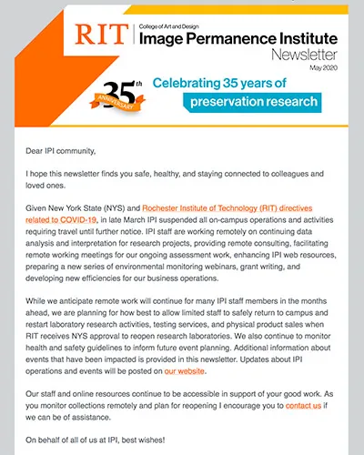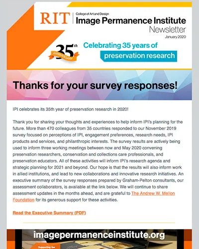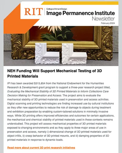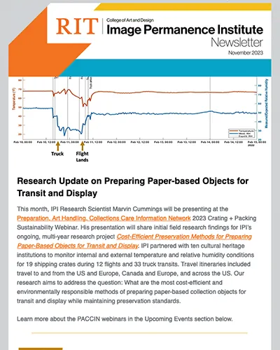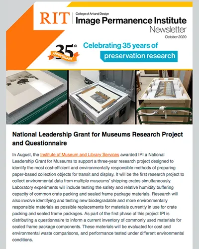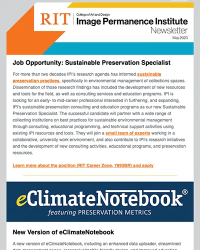 An electronic publication produced by the Image Permanence Institute (IPI) and distributed to subscribers twice a year to provide updates on activities and initiatives underway at IPI.