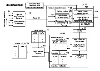 Spectral Printing Model: The system utilizes a spectral printing model to predict the spectral reflectance of printed colors based on ink amounts. This provides a fundamental basis for accurate color prediction.