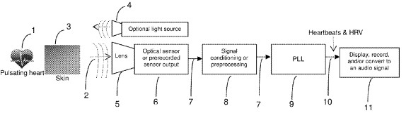The primary innovation of this patent lies in its ability to detect subtle skin movements caused by cardiac activity without requiring direct physical contact with the patient. The system employs an optical sensor that measures variations in light reflected from or transmitted through the skin. These variations, which are imperceptible to the naked eye, are caused by the mechanical pulsations of the heart as blood flows through superficial capillaries. A key component of the system is a phase-locked loop (PLL) that processes these minute optical signals to accurately extract heartbeat information. The PLL is adept at tracking these periodic, low-amplitude signals, effectively filtering out noise and other motion artifacts that often plague conventional remote sensing methods. The system can even operate in ambient light conditions, though an optional light source can be used for improved performance. The output can be displayed, recorded, or converted to an audio signal, providing versatile utility.