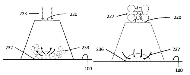 A key innovation of this patent lies in the unique geometry of the volcano-shaped structures. These structures are positioned on a heated substrate and are submerged in a liquid. Their design creates a contained volume between the structure and the substrate, with an opening at the base (or a gap) for liquid inflow and a top opening (or hole) for vapor expulsion. This configuration establishes a controlled, predominantly continuous flow pathway: vapor bubbles generated at the heated surface are efficiently directed out through the top opening, while fresh liquid is continuously drawn in through the base opening.