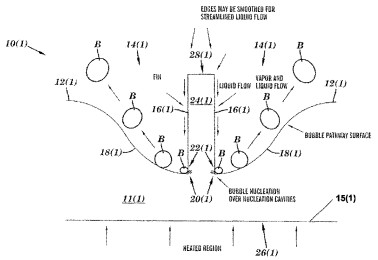 A key novel aspect of this patent is the design of asymmetric shaped cavities extending into a heated substrate. These cavities feature a sidewall that intersects with a bubble pathway surface at a different slope, creating a geometry specifically configured to non-gravitationally direct fluid that is moving along the sidewall out along the bubble pathway surface. This design facilitates the rapid removal of vapor bubbles from the heated surface and promotes continuous liquid flow towards the nucleation sites, preventing the formation of insulating vapor films that can hinder heat transfer. The patent details how these features enable streamlined liquid flow and directed bubble departure, optimizing the two-phase flow dynamics at the boiling interface.