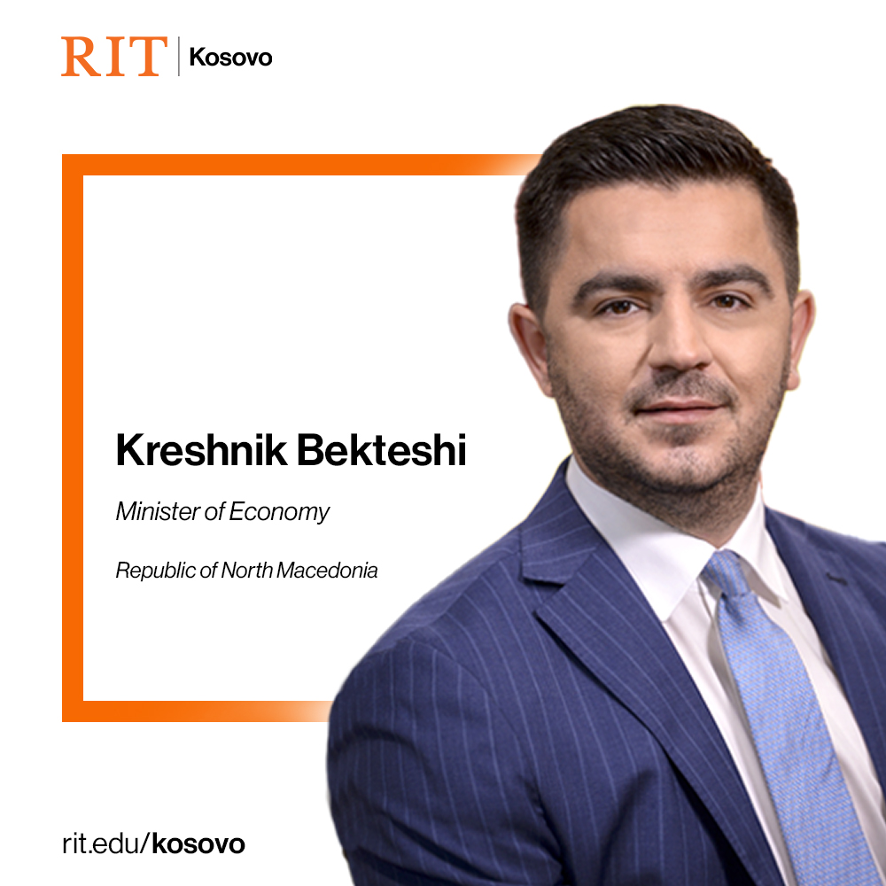 Kreshnik Bekteshi was appointed Minister of Economy in the Government of the Republic of North Macedonia in 2017 and reappointed in 2020. In January 16, 2022 elections, Kreshnik once again retained his post. Right after graduating from RIT Kosovo (A.U.K) in 2008 with a degree in Management and Public Policy, Kreshnik was appointed the Head of the International Office of the Agency for Foreign Direct Investment and Export Promotion of the Republic of Macedonia, promoting the business climate of Macedonia by attracting foreign direct investments from EU countries in pursuing joint business cooperation.
