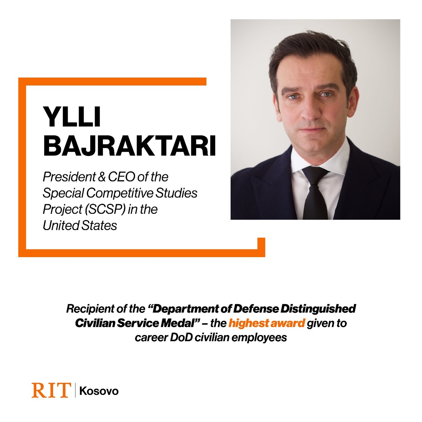 RIT Kosovo (A.U.K) has the distinct honor to announce that Mr. Ylli Bajraktari, CEO of the Special Competitive Studies Project (SCSP) in the United States will be joining us as our Keynote Commencement Speaker on May 22, 2023 and Keynote Speaker at the Gala Dinner on May 23, 2023. Ylli is a successful and established Albanian-American executive in the field of national security in the U.S., leading the SPCP which is a non-partisan initiative chaired by Dr. Eric Schmidt, the accomplished technologist and former longtime CEO and Chairman at Google. At SCSP, Ylli is spearheading efforts to strengthen America’s long-term competitiveness as artificial intelligence (AI) and other emerging technologies reshape the national security, economy, and society.