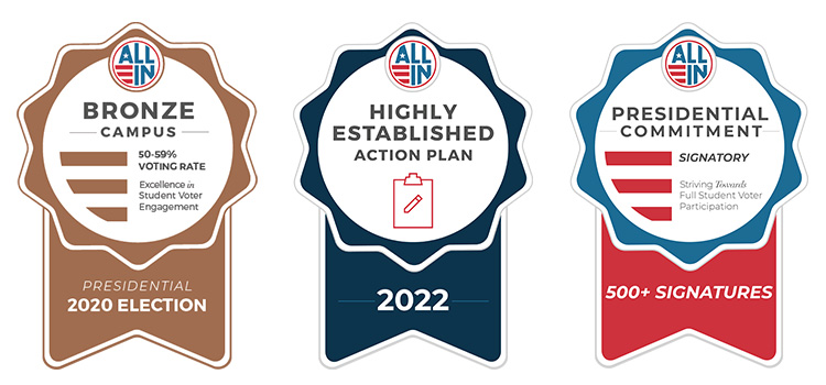 RIT is proud to be recognized as one of ALL IN Campus Democracy Challenge’s Most Engaged Campuses for College Student Voting. In addition to developing a 2024 democratic engagement action plan, RIT also participated in the ALL IN Campus Democracy Challenge, shared 2020 campus voting data with ALL IN, and is a signatory on ALL IN’s Higher Education Presidents’ Commitment to Full Student Voter Participation.