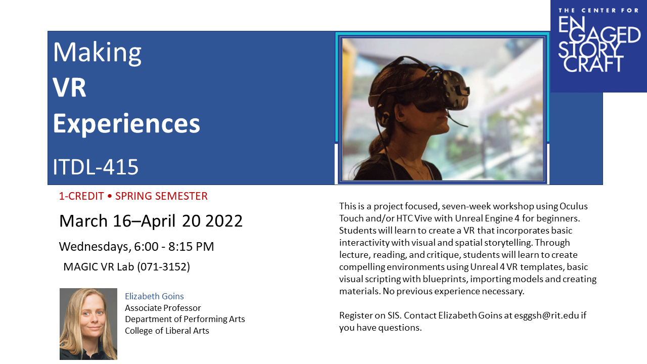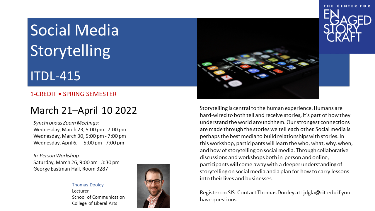 Learn more about the Literature and Media Minor programIn the 21st century, narratives transcend traditional boundaries and come to life across various platforms. Transmedia storytelling is an innovative approach that has gained significant prominence in the digital age, extending a narrative universe beyond a single medium, allowing the story to exist and evolve through various channels such as film, television, books, graphic novels, video games, social media, augmented reality, and more. This immersion introduces students to the concept of transmedia storytelling and teaches the application of the concept to a range of media, including film, creative writing, screenplays, theater, and more. Students will take ITDL/DHSS-500 first (or synchronously with other immersion courses) and then choose from the remaining optional electives. This immersion will appeal to students from the colleges of Liberal Arts, Art and Design, Computing and Information Sciences (including game design), as well as other colleges. The immersion can be completed either at RIT's main campus, off-site in Los Angeles (as part of the Study Away: LA program), or at one of RIT's global campuses.