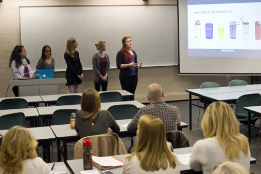 Nineteen students in four groups developed ad campaigns for Nalgene and pitched them to the company's marketing director as their capstone in a campaign management class. -