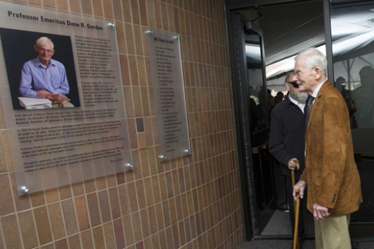 Dane R. Gordon, who retired in 2000, cut the ribbon Friday at the Dane R. Gordon Seminar Room in Liberal Arts Hall, dedicated to him for his many years of outstanding service. -