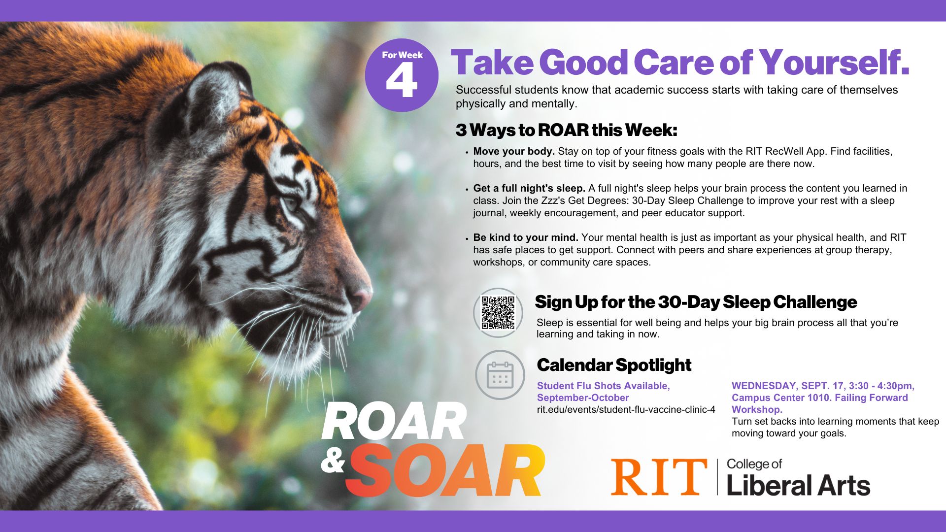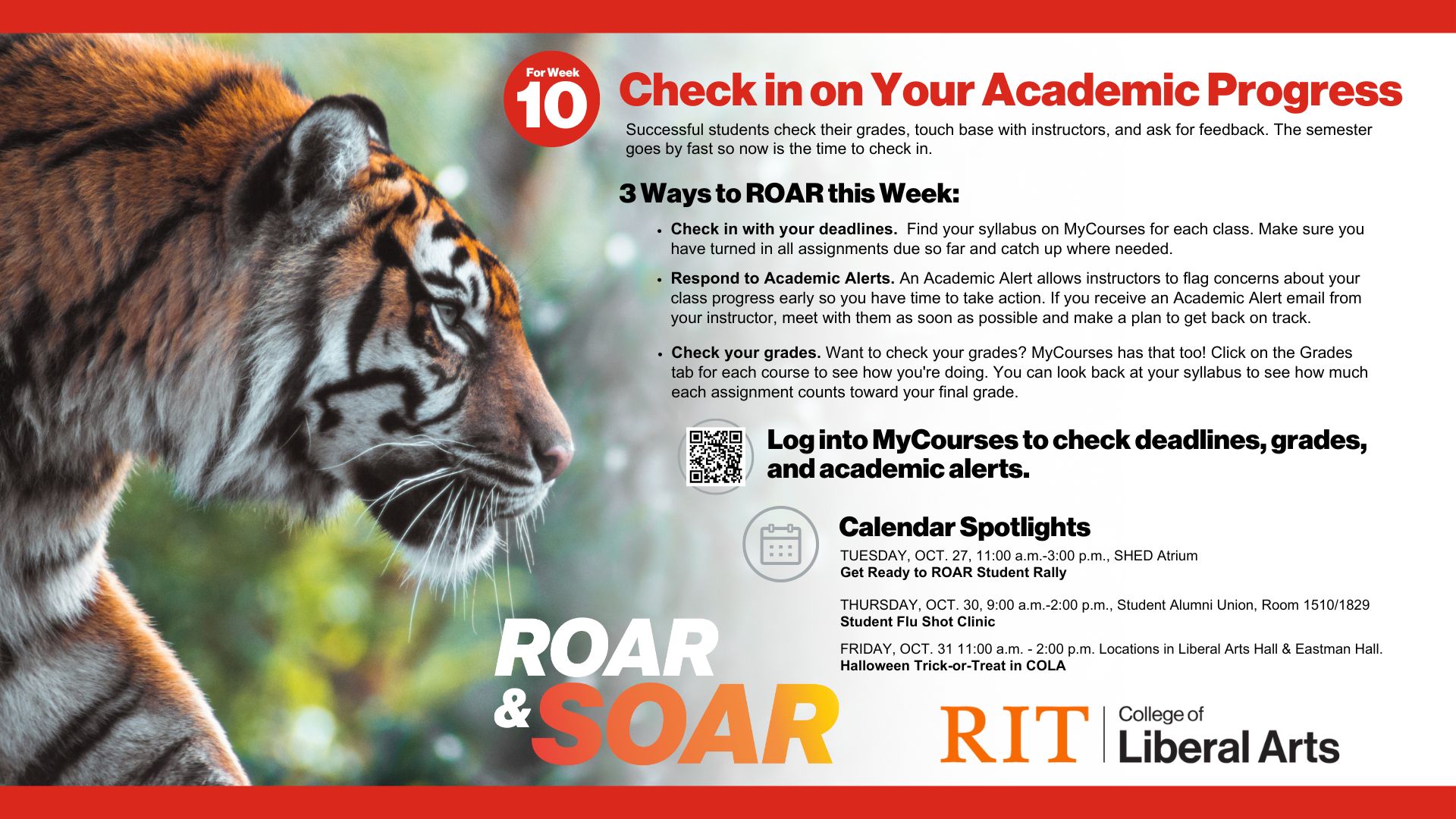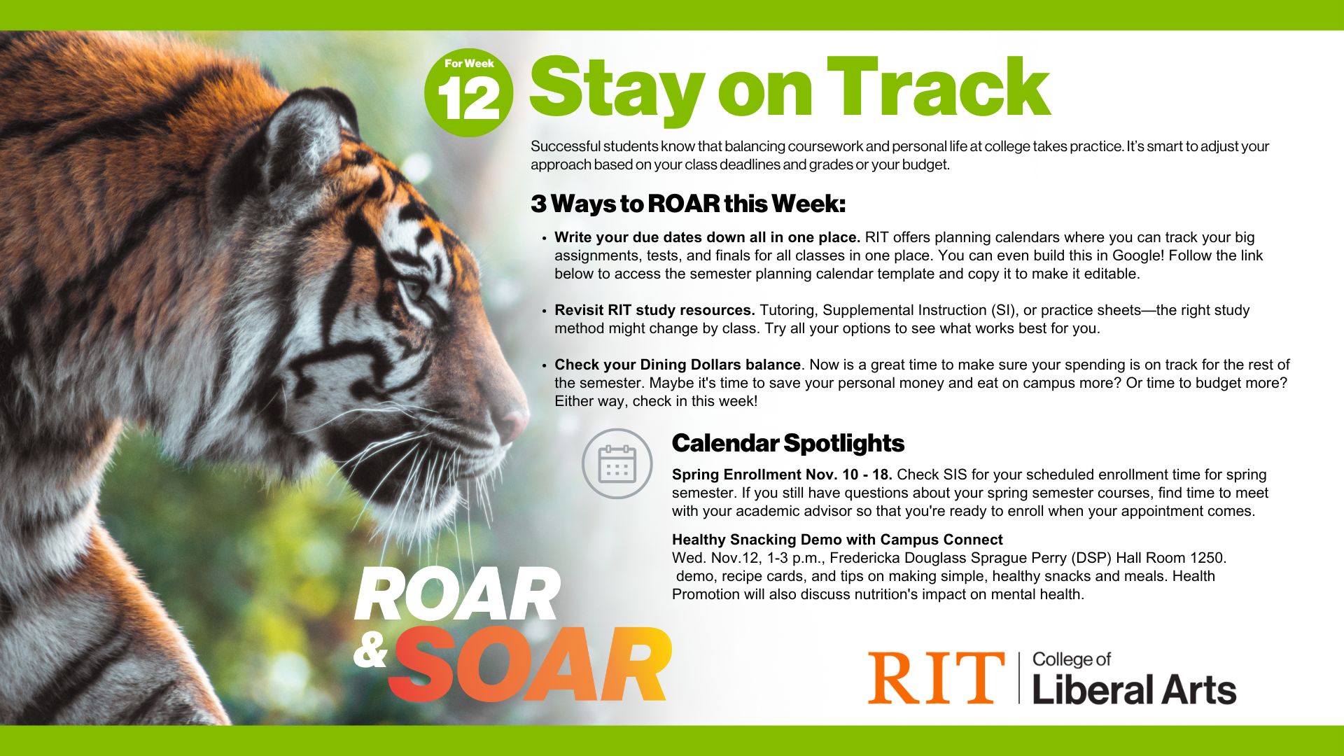 First-year students are emailed weekly or bi-weekly Roar and Soar messages with advice for making the most of their RIT experience. They can also download the posters below for a round-up of advice and action item reminders.