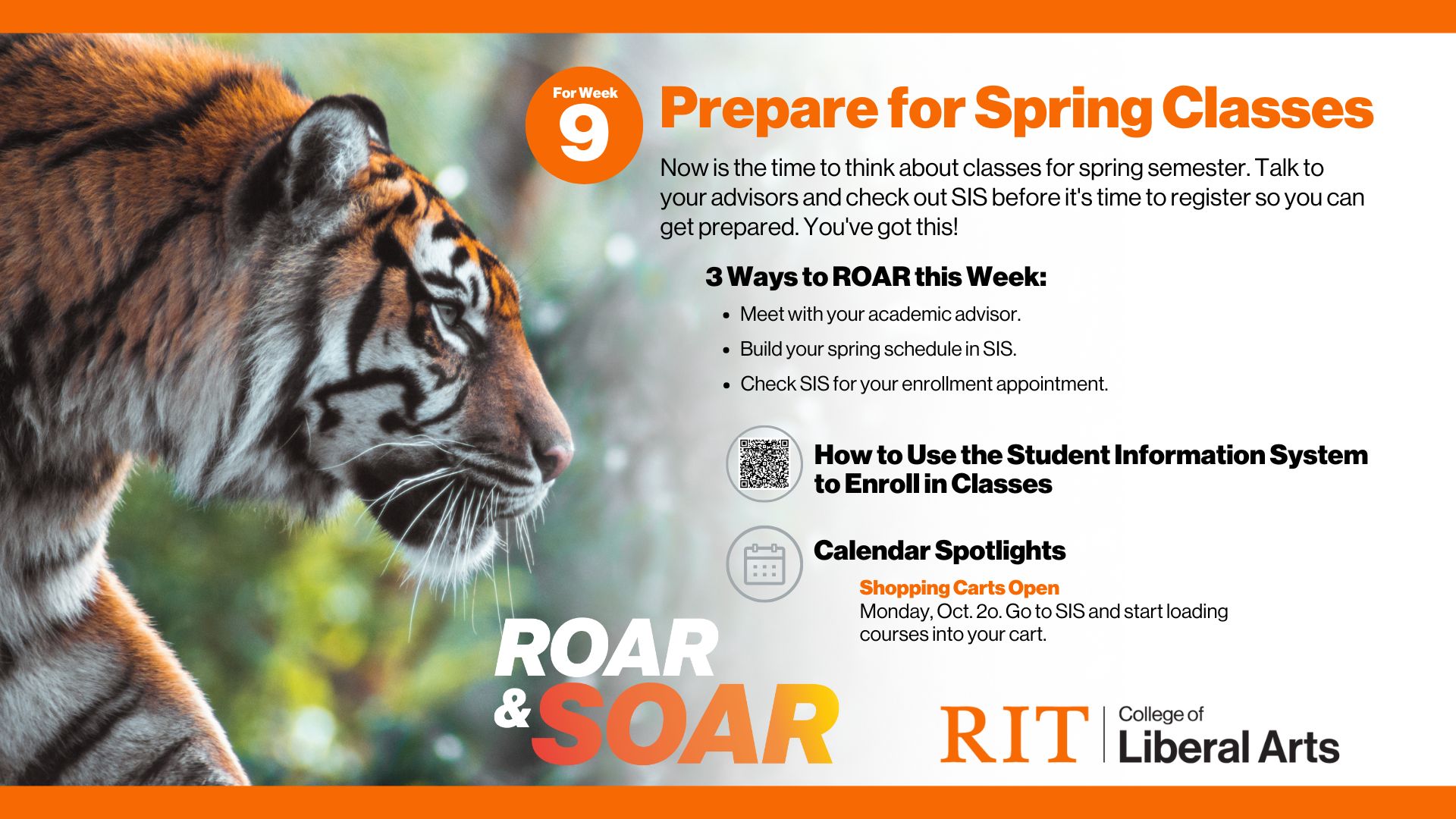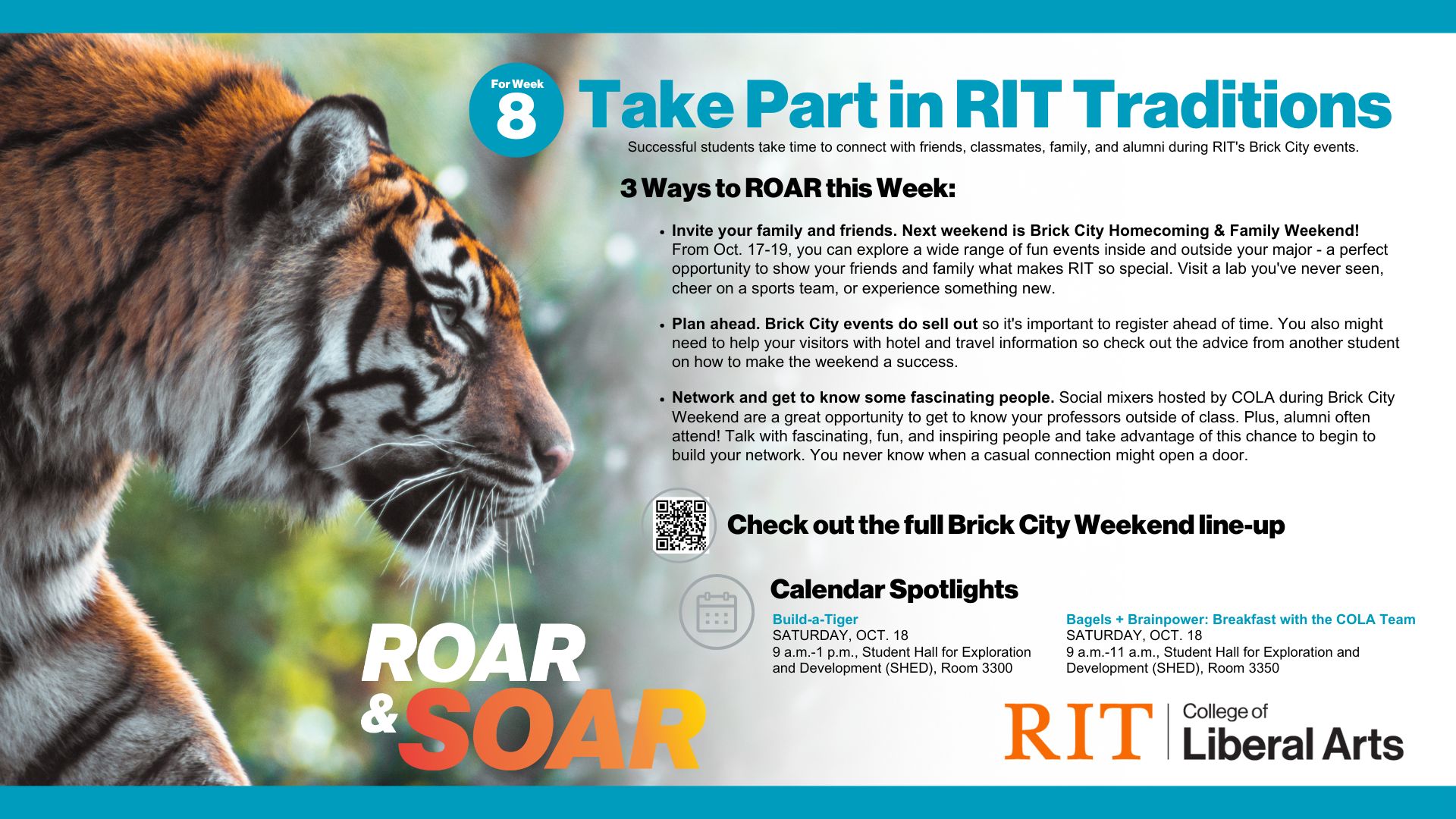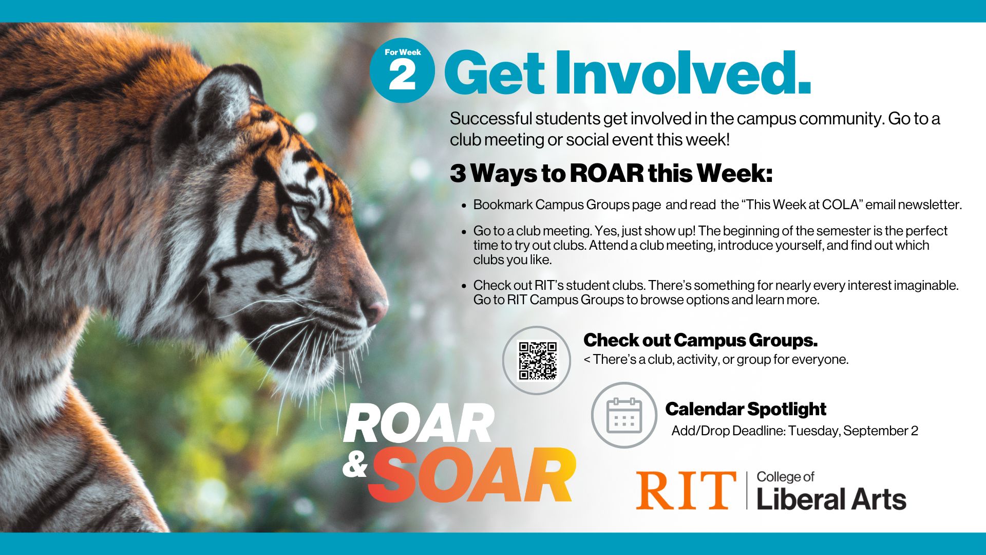First-year students are emailed weekly or bi-weekly Roar and Soar messages with advice for making the most of their RIT experience. They can also download the posters below for a round-up of advice and action item reminders.